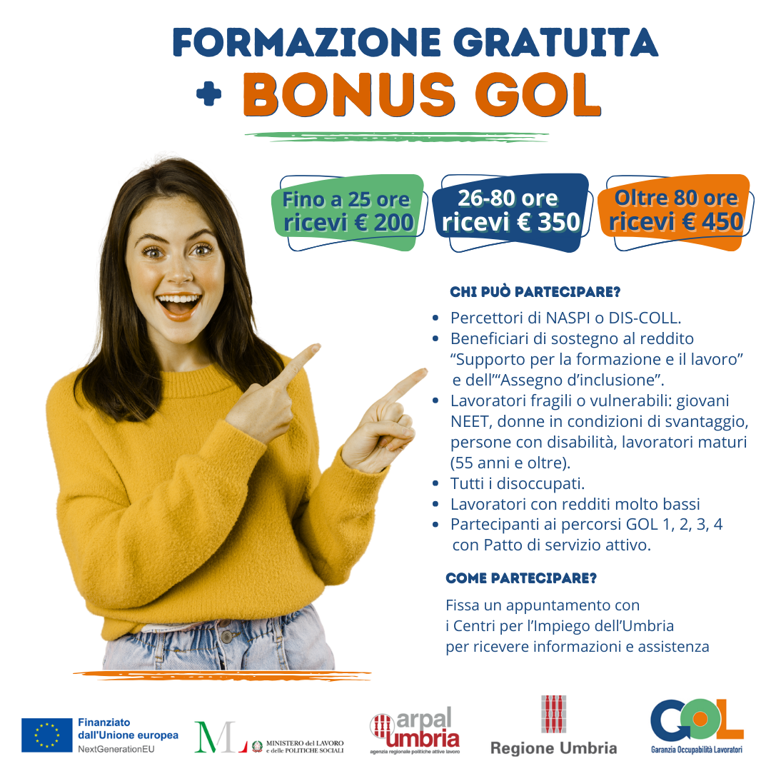 Si ricorda che l'Avviso pubblico “Bonus per la partecipazione alla formazione GOL” prevede alla SEZIONE 2.1 quanto segue: "Comunicazione I soggetti realizzatori sono tenuti ad assicurare la visibilità del finanziamento dell’Unione per mezzo dell’emblema dell’UE e della dicitura “Finanziato dall’Unione Europea – NextGenerationEU” in tutte le attività di comunicazione a livello di progetto. Inoltre, quando viene mostrato in associazione con un altro logo, l’emblema dell’Unione Europea deve essere mostrato almeno con lo stesso risalto e visibilità degli altri loghi. L’emblema deve rimanere distinto e separato e non può essere modificato con l’aggiunta di altri segni visivi, marchi o testi. Oltre all’emblema, nessun’altra identità visiva o logo può essere utilizzata per evidenziare il sostegno dell’UE. La relativa stringa dei loghi è resa disponibile da ARPAL Umbria nel sito istituzionale nella sezione dedicata al Programma GOL."